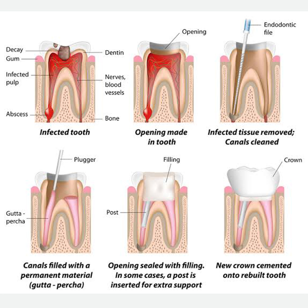 In root canal treatment the pulp is removed from canal followed by placement of medicine that alleviate the pain.